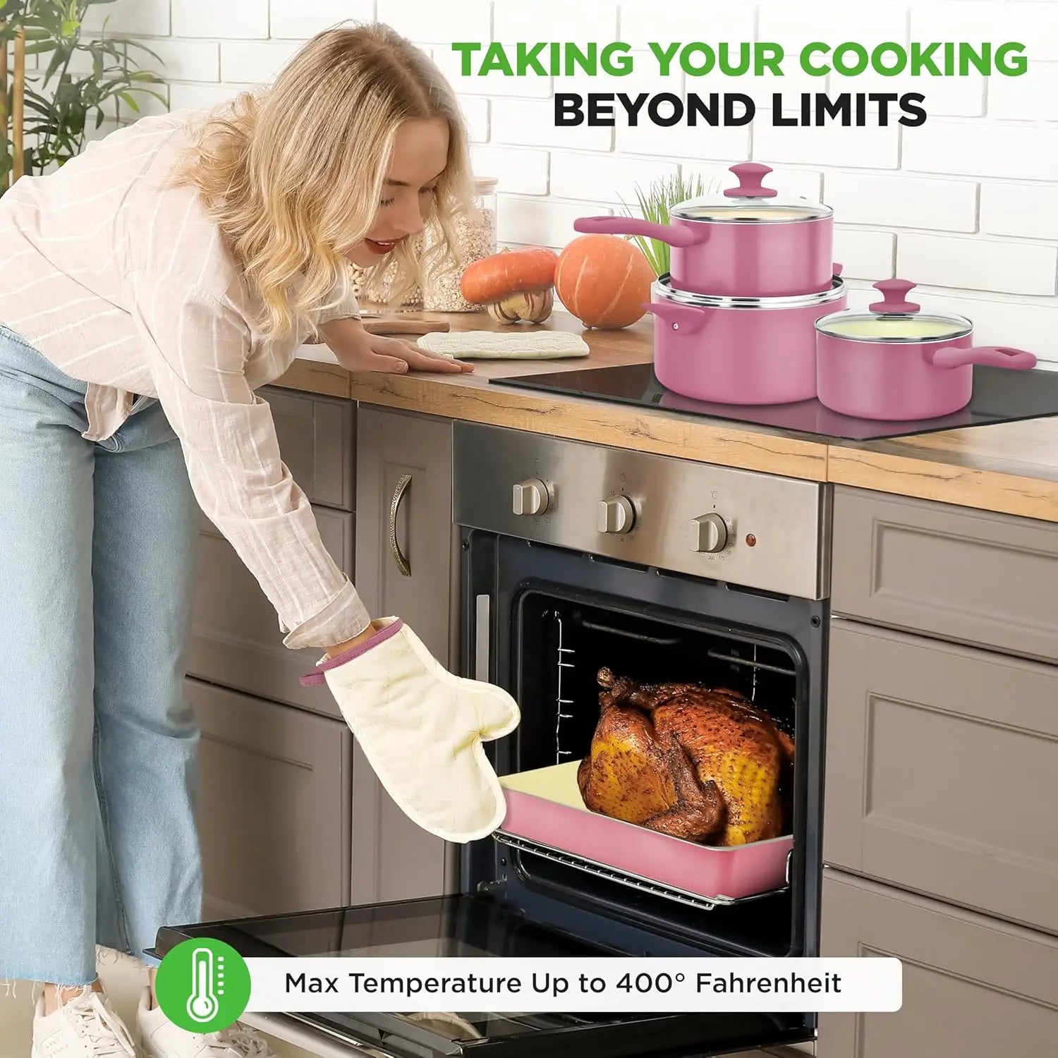 4. VERSATILE FOR ANY COOKTOP - Safe for gas, electric, and induction cooktops (except small egg pan & milk pot), this cookware set is perfect for all your cooking needs. Whether stovetop or oven, it offers flexibility for various recipes and techniques.