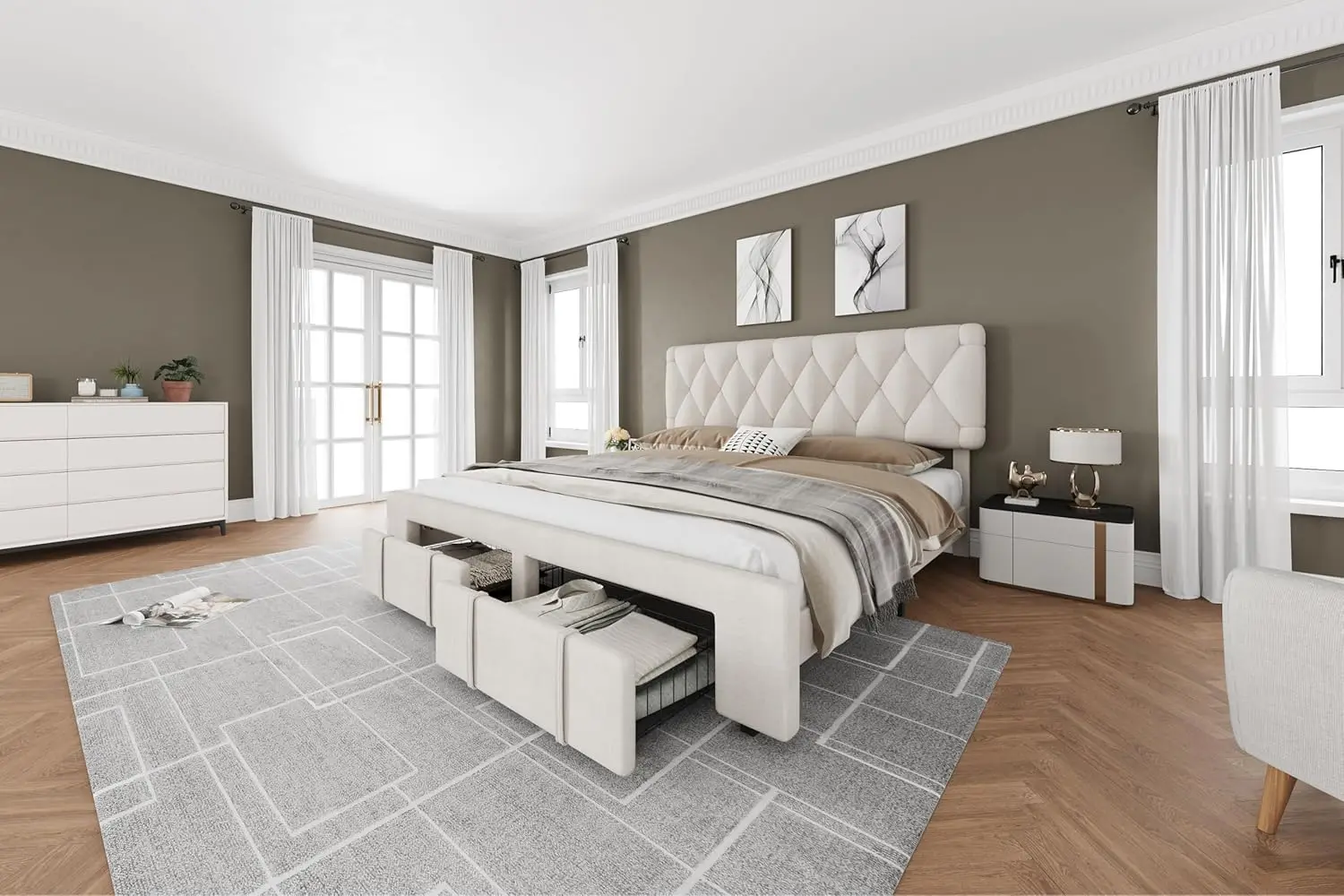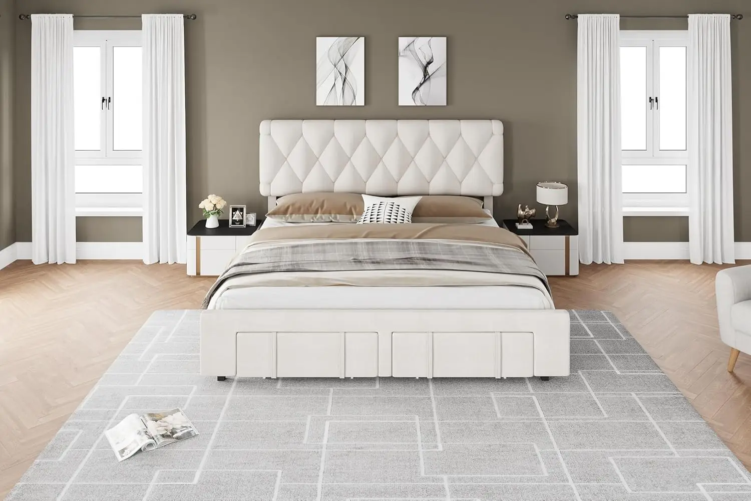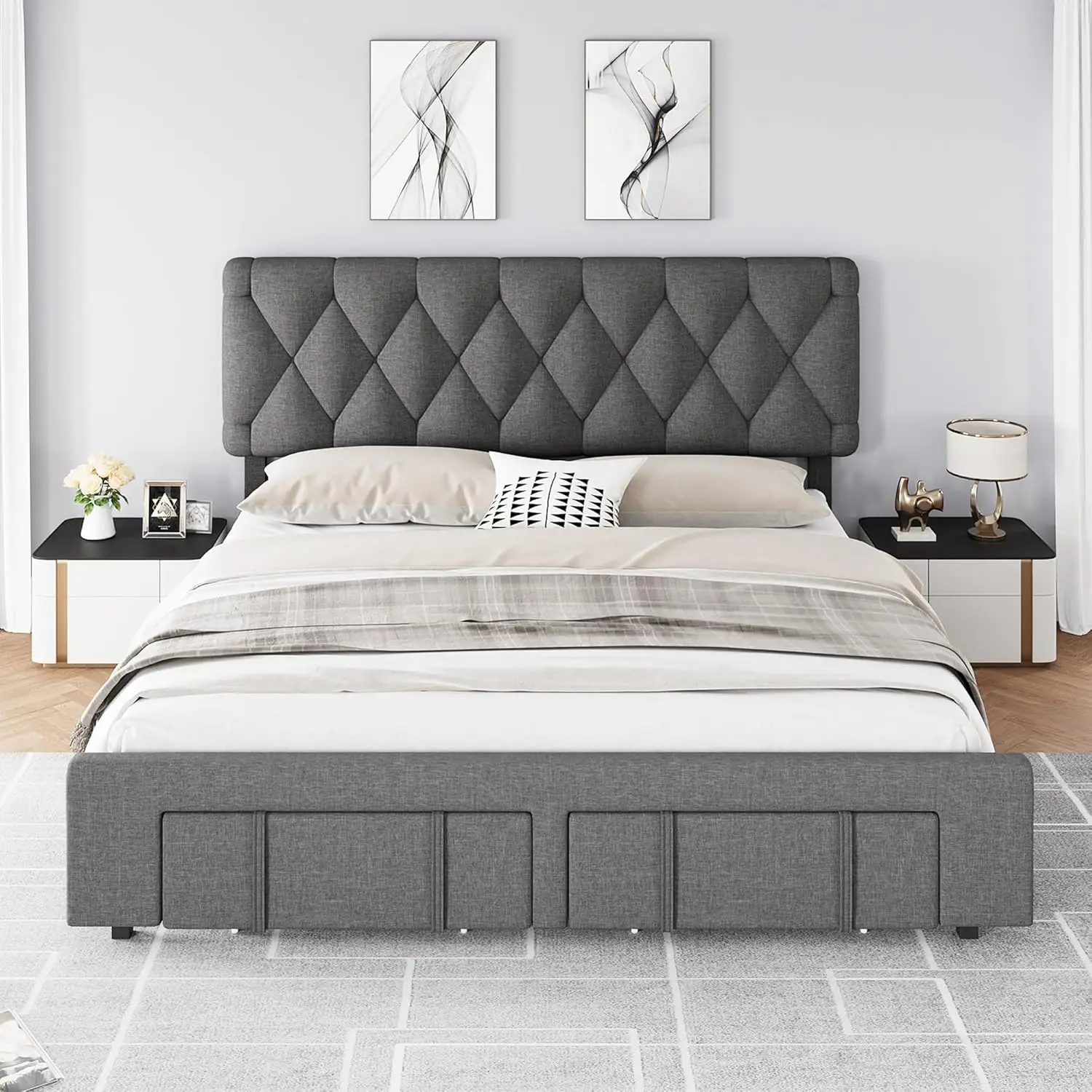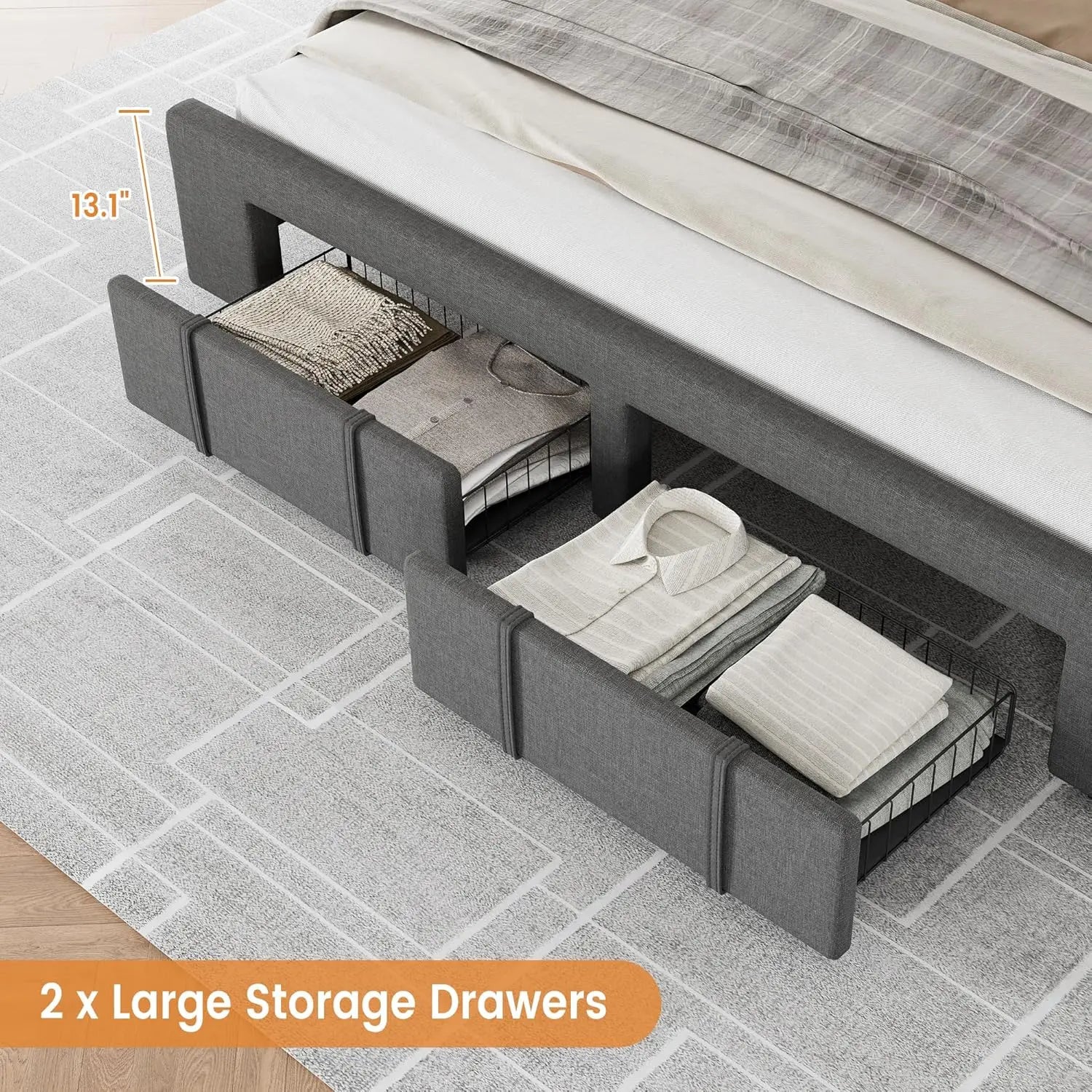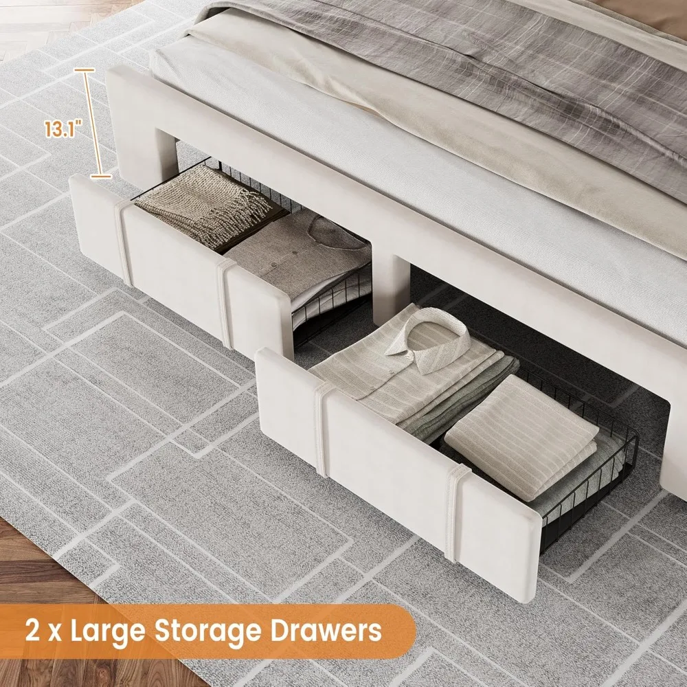 - 【Spacious Storage Capacity】 The king-size bed frame features two storage drawers that provide the convenience of ample storage space, perfect for holding shoes, suitcases, and luggage. These drawers are equipped with wheels for easy access to clothes or bedding, helping you maintain a neat and organized room.