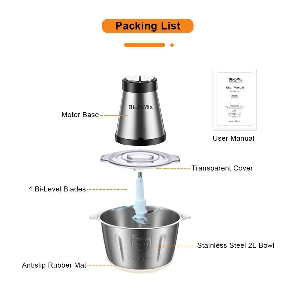 BioloMix 2 Speeds 500W Stainless Steel 2L Capacity Electric Chopper Meat Grinder Mincer Food Processor Slicer