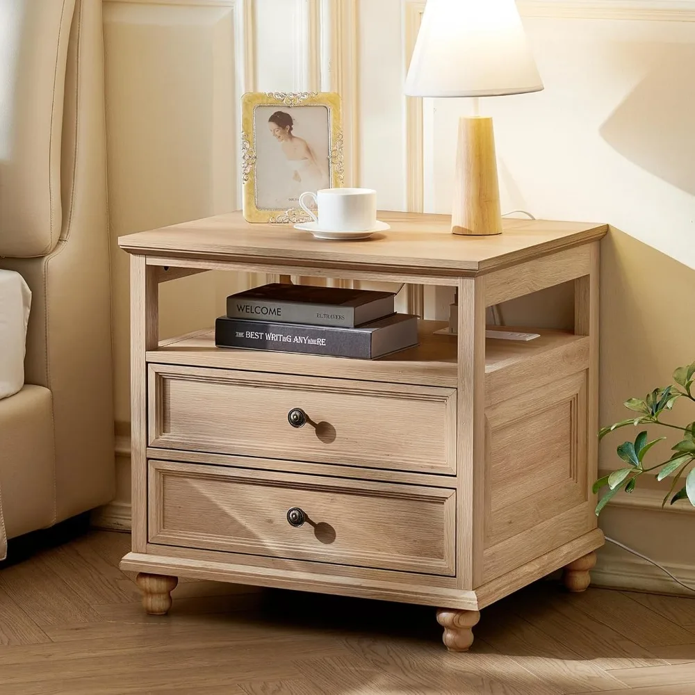 - 【Large Storage Space】This side table with charging station has a spacious 24" tabletop, an open compartment, and large-capacity double drawers, combining functions of storage and display. You can organize high-frequency items or decorations in an orderly manner and enhance the style of your bedroom. The drawers of the wood nightstand are equipped with smooth and silent metal rails and retro round knob handles for your daily use.