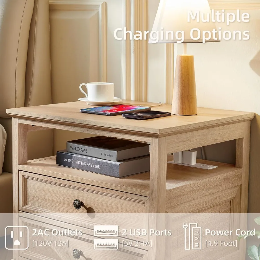 Farmhouse Nightstand with Charging Station, 24 Wide End Table with 2 Drawers, Natural dresser
