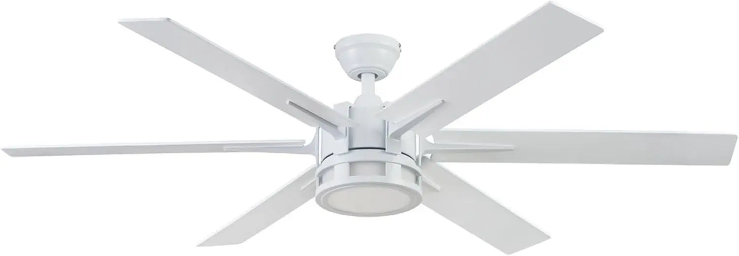 This 56-inch indoor fan is designed to efficiently cool large spaces exceeding 400 square feet, making it perfect for living rooms, master bedrooms, offices, and studios. During the winter months, you can reverse the fan's direction to circulate warm air at a low speed. This ceiling fan comes with a remote control, allowing you to adjust the fan light, speed, and features like Home Shield or Walk Away Delay from any location. The remote also includes batteries and can be conveniently stored in its wall dock. The fan is equipped with an energy-efficient, long-lasting, and dimmable LED light. With a stylish and modern design, it features six sleek dual-finish blades for optimal air flow and three quiet fan speeds. Choose from two contemporary finish options, Black Pine and Pewter, to match your evolving decor preferences.