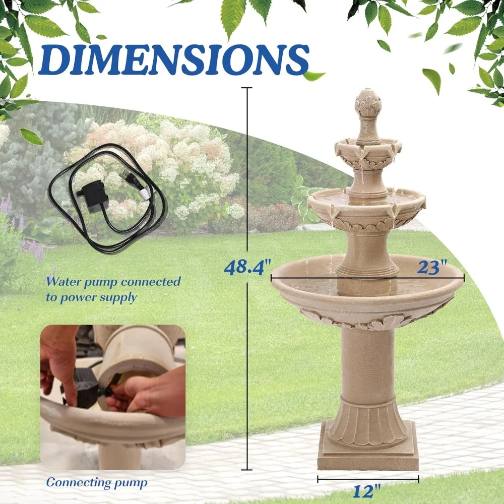 This garden fountain is a three-tiered outdoor water feature that creates a calming atmosphere with its relaxing water flow, resembling the sound of a natural waterfall. Each tier has 12 water outlets, adorned with carved flowers and featuring an Indian-style design, making it an ideal centerpiece for any garden or indoor space. The fountain is versatile, suitable for both indoor and outdoor use, and its pineapple Italian cascading design allows it to blend well with various home and garden decorations. Made from high-grade resin, this freestanding water fountain is durable, resistant to weather elements, and designed for long-lasting use. Safety and convenience are ensured with an official UL listing, an American plug for 110V-120V 60Hz input voltage, and an adjustable pump speed, requiring only a connection to the pump for operation.
