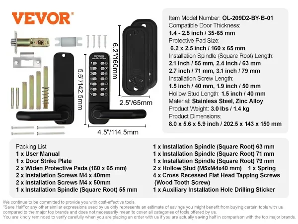 When choosing a suitable mechanical door lock, door size is an important factor to consider. With multiple spindles and screws included (2.1"/55mm, 2.4"/63mm, 2.7"/71mm, 3.1"/79mm), our lock fits doors of various thicknesses (1.4"-2.5"/35-65mm). So sit back and enjoy the flexibility of choice.