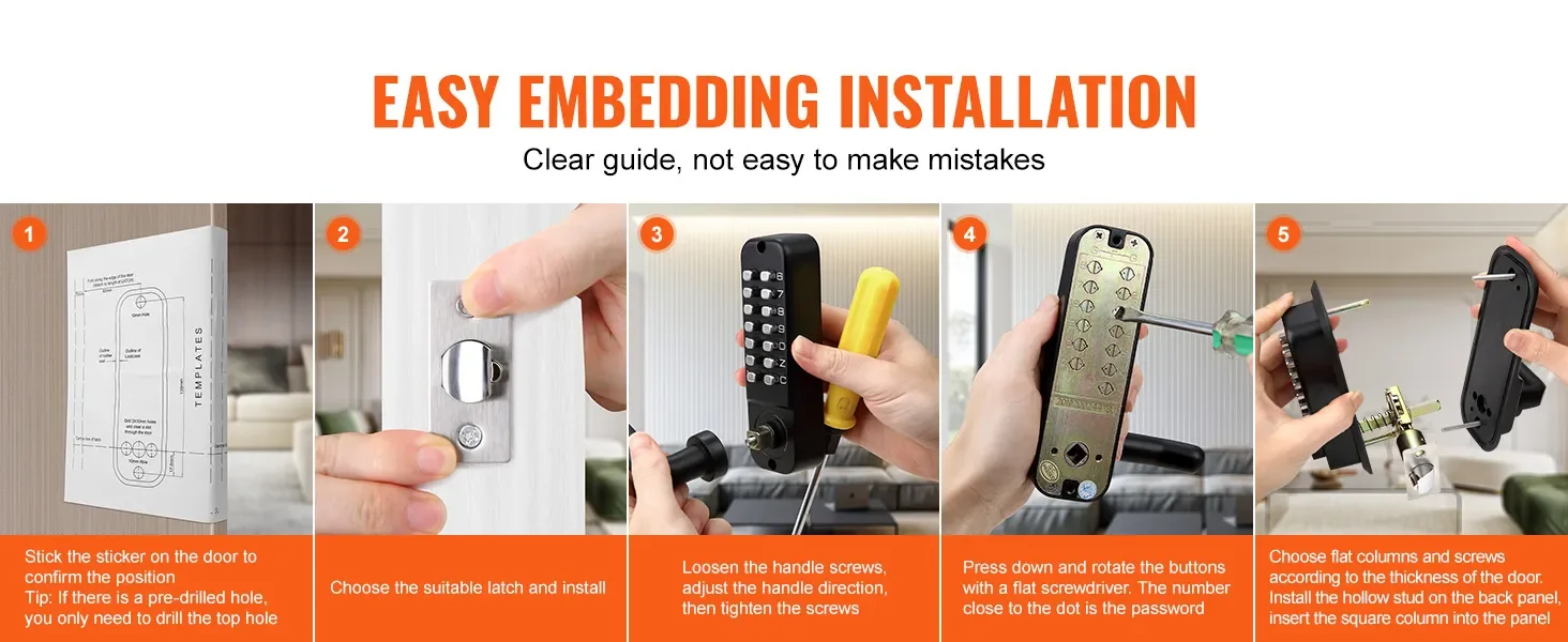 A mechanical lock is indispensable to safeguard your property and safety. Ditch the hassle of electric wires and keys. Just close your door, and it's locked. Plus, setting or changing the password is a piece of cake with a screwdriver. Say goodbye to complexity and hello to hassle-free security.