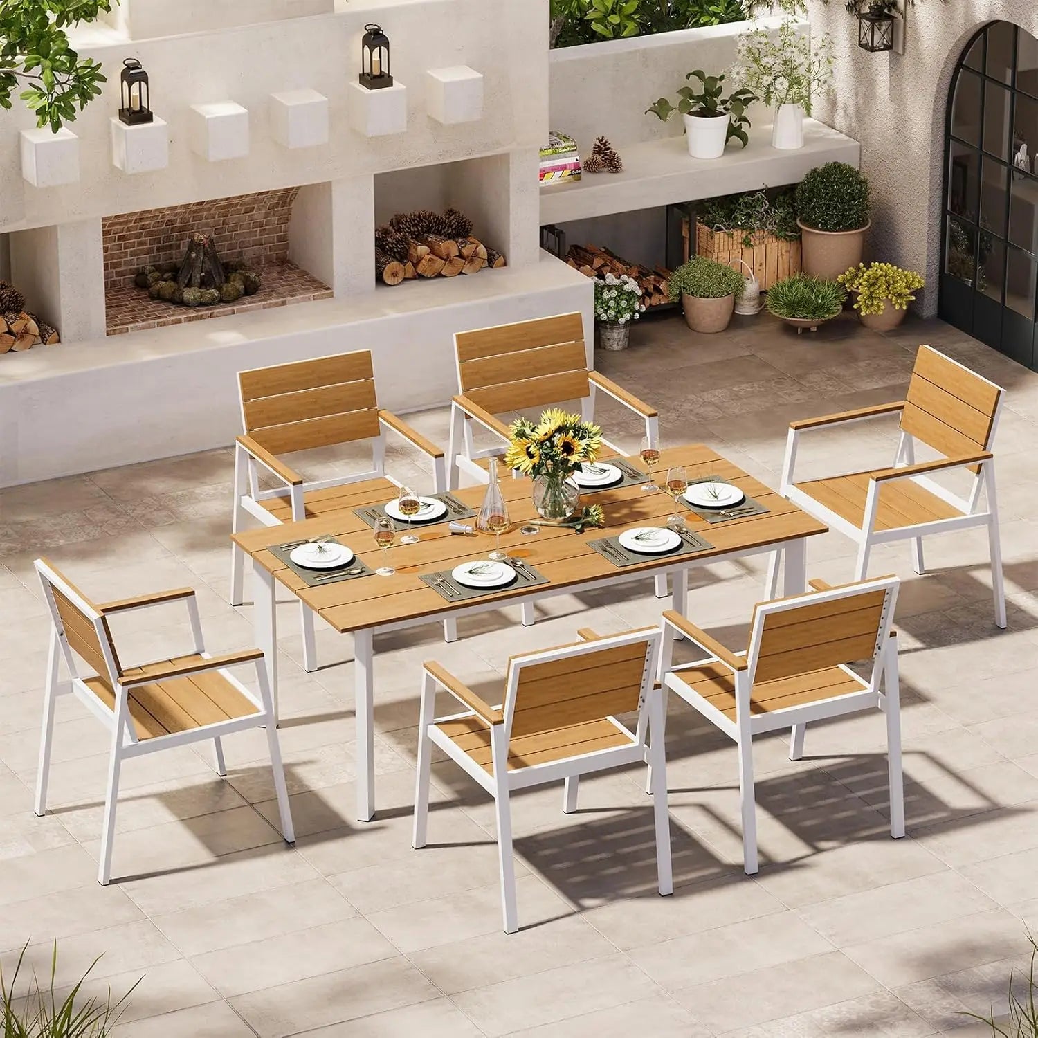 Modern Outdoor Dining Set: This item is shipped in 4 boxes and may not be delivered at the same time. Elevate your outdoor living space with our stylish patio furniture set, featuring 1 table and 6 chairs. Designed with nature-inspired color stitching, adds a touch of elegance to your garden. Perfect for family gatherings or leisurely meals, creating an inviting atmosphere for memorable moments