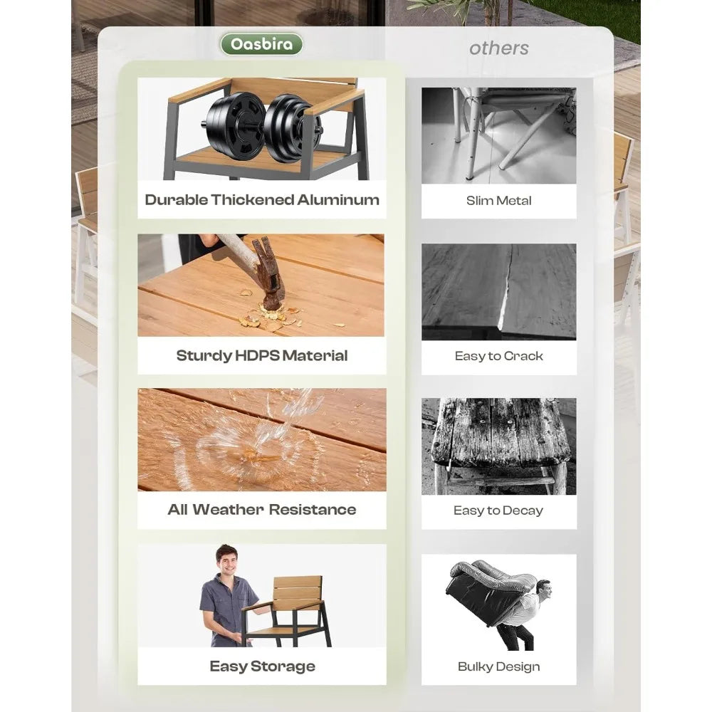 Premium Material: This outdoor table and chairs set is crafted with high-quality aluminum frame and HDPS material. The aluminum frame features a double-layer design, engineered for exceptional stability and load-bearing capacity. The HDPS tabletop offers a natural wood-like finish, combining elegance with durability and weather resistance