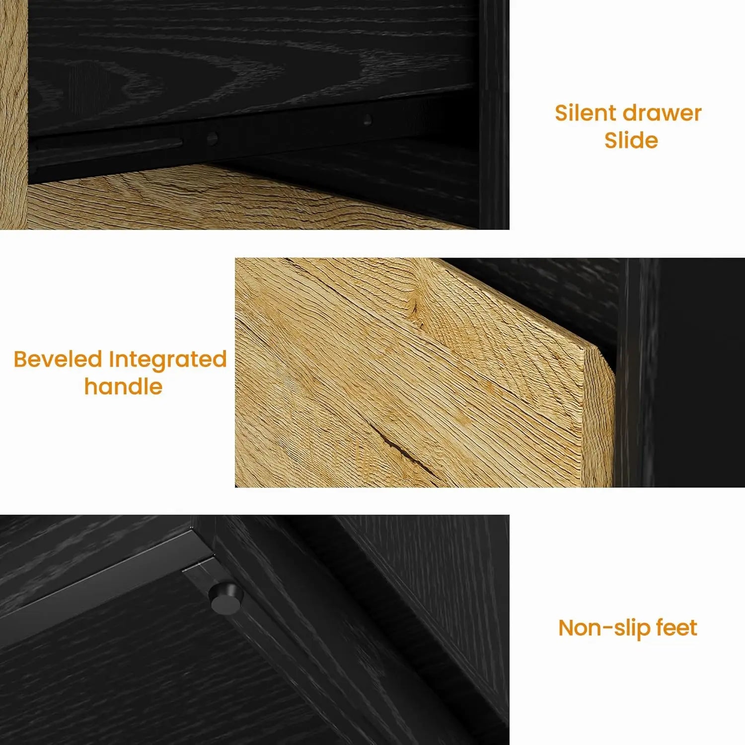 2. Stylish Design: The black frame paired with the warm wood-colored nightstand features a wood grain finish that perfectly blends with modern minimalist design. The handle-free design and hidden sliding system create a sleek, clean look, eliminating unnecessary visual distractions\u2014simple yet sophisticated.