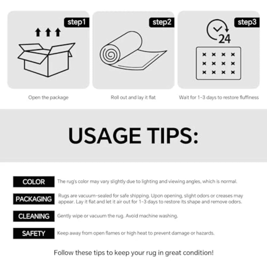 【Instructions for Use】 Partial cleaning is recommended. Using a low power vacuum cleaner or adding some mild detergent and cleaning gently by hand instead of machine will make the carpet more durable. We use vacuum packing carpet for shipping, the shape of the carpet will be back to normal after 2-3 days. Please give this soft carpet some time to get better!