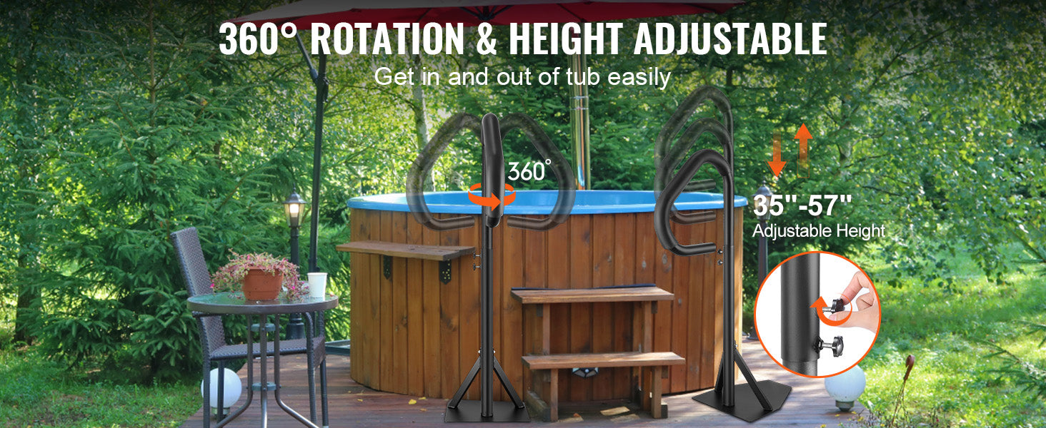 SucceBuy hot tub handrail is crafted from aluminum alloy, lightweight, sturdy, and corrosion-resistant. It can withstand various weather conditions while offering an appealing aesthetic. 360-degree rotation and 35"- 57" height adjustable handrail fit different bathtub sizes and varying user heights.