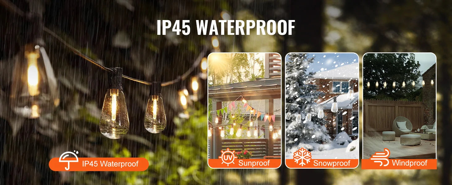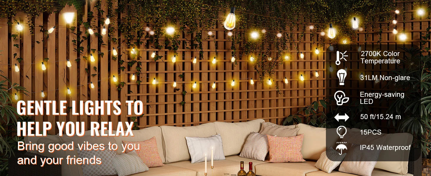 Safe, Durable, and Reliable:Designed with your safety in mind, these patio lights comply with FCC standards. Rated IP45 waterproof, they can withstand snow, rain, wind, sun, and extreme temperatures, ensuring long-lasting reliability for all-season outdoor use Customizable Lighting for Every Mood:Use a compatible dimmer switch (sold separately) to adjust the brightness, tailoring the lighting to suit any occasion. Whether you’re looking for a soft, romantic glow or a brighter, lively atmosphere, these lights give you the flexibility to set the perfect mood Ideal for Any Occasion:These versatile string lights are perfect for both indoor and outdoor use. Whether you’re decorating for a wedding, hosting a party, or setting up a cozy ambiance for a dinner, they bring a charming, inviting glow to any space Spacious Coverage for Larger Areas:Measuring 50 ft (15.24 m) in length with 15 bulbs, these outdoor string lights are long enough to cover expansive areas. The durable, flexible cable resists cracking in cold weather, and its high-quality insulation provides protection against electrical hazards, ensuring secure use Warm, Relaxing Light:With a 2700K color temperature, each bulb emits a gentle, non-glaring 31 lumens of light, perfect for creating a relaxed, cozy ambiance. Ideal for unwinding at the end of the day or setting the mood for a friendly gathering, these lights provide a soft, welcoming glow
