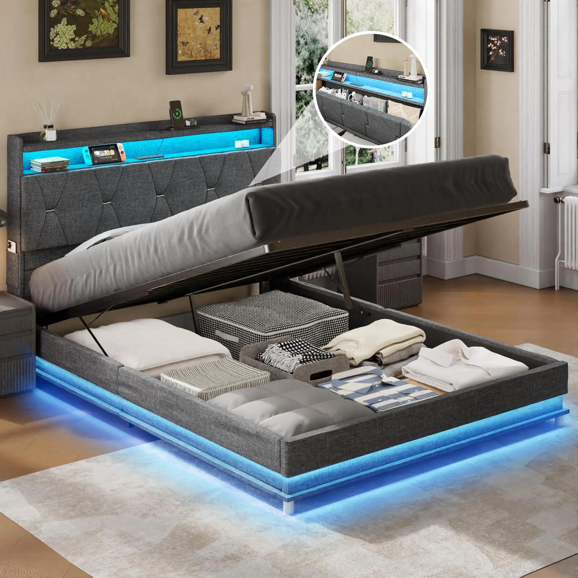 Vabches Lift Up Bed Frame with Storage Headboard&Power Outlet, LED Lights Upholstered Platform Bed Frame for Bedroom Noise-Free