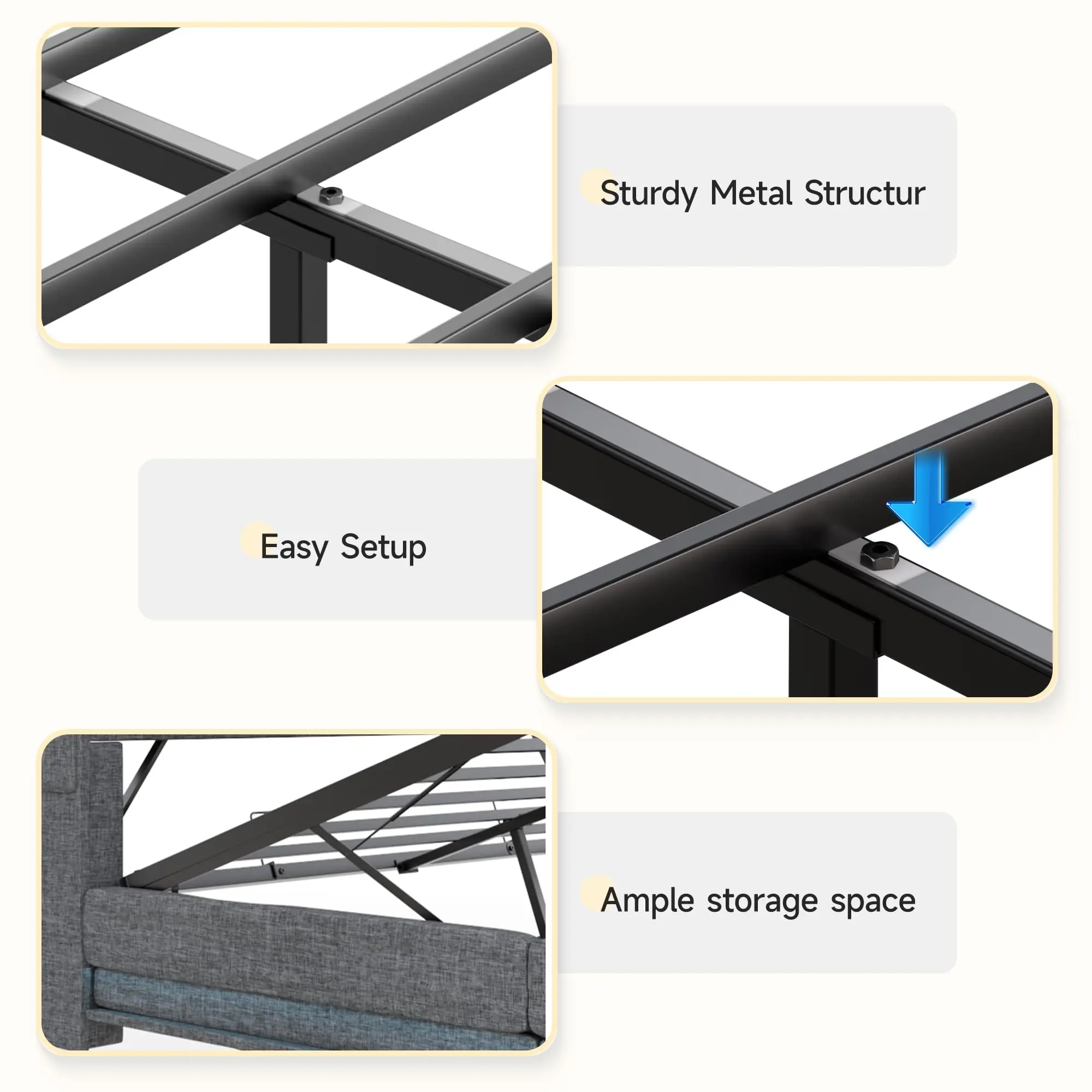 【STURDY AND DURABLE】: This bed frame with storage comes with, made of high-grade MDF eco-friendly material, the sturdy metal frame comes with soft foam and linen. This material is safe and environmentally friendly, ensuring no dangerous or unpleasant odors. The sturdy steel frame and extra center legs make the bed more load bearing and less likely to buckle
